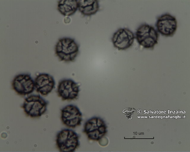 Spore 7.00-8.00 x 6.00-7.25 micron, globose, verrucose, con verruche alte fino ad 0,8-1 micron, crestate-connesse, a formare un reticolo quasi completo, con maglie chiuse. Plaga soprailare debolmente amiloide.