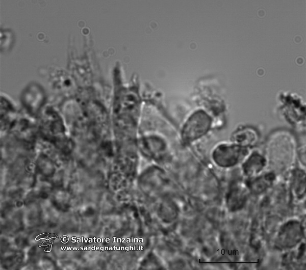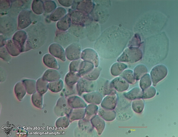 Spore ialine, lisce, non amiloidi in Melzer, ellissoidali ed allungate a goccia con apicolo in evidenza, misure rilevate 5.65-7.92(8.08) x 4.26-5.32 micron. Basidi claviformi, in prevalenza tetrasporici.