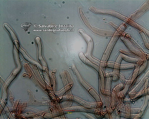 L'esame microscopico mostra una cuticola formata da un trichoderma un po' disordinato di ife cilindriche, erette o anche sinuose, settate, ad apice ottuso. Spore cilindrico-fusiformi, lisce, guttulate, misure medie 11-14 x 5,5 - 6 micron.