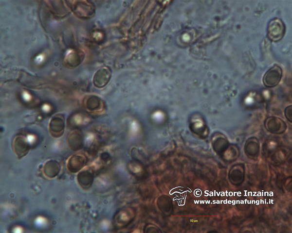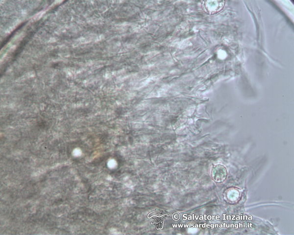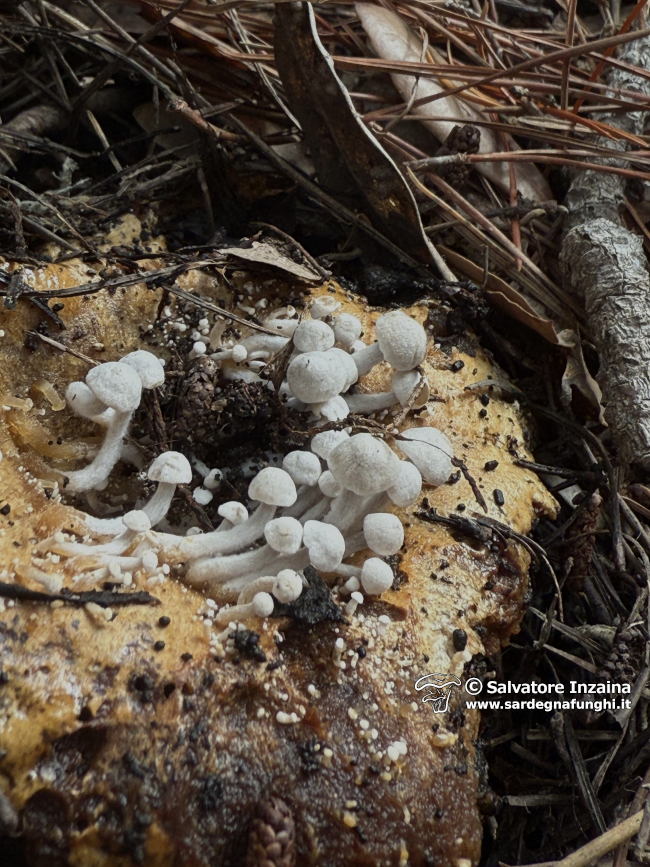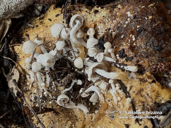 Piccoli funghetti di 0.5-1 cm, cappello conico-campanulato, fibrilloso-sericeo,infine pruinoso persistente; lamelle rade, annesso-sinuate, ispessite e anastomosate, biancastre; gambo esile, fistuloso, concolore; carne esigua, molle, biancastra, di per sč inodore (se non fosse per l'odore sgradevole emanato dal carpoforo in disfacimento formante il substrato); crescita in gruppi su Russula sp. o Lactarius sp. in decomposizione.