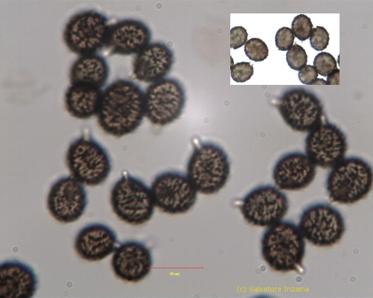 Spore subovoidali, misure rilevate comprese tra 6.64-8.48 x 5.51-7.10 µm., verrucose, verruche subconiche discretamente basse non più di 0.4 µm di altezza, discretamente crestato-connesse a formare un reticolo parziale talvolta con maglie chiuse, tacca soprailare piccola tondeggiante amiloide.