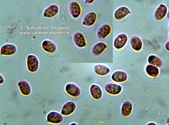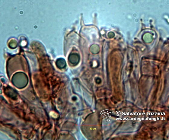 Spore 5-6 x 3-3.5 µm, lisce, ellissoidi, guttulate. Filo lamellare formato da basidi claviformi in prevalenza tetrasporici e da basidioli. Cheilocistidi assenti o comunque poco differenziati. Presenti ife marginali cilindriche e settate.