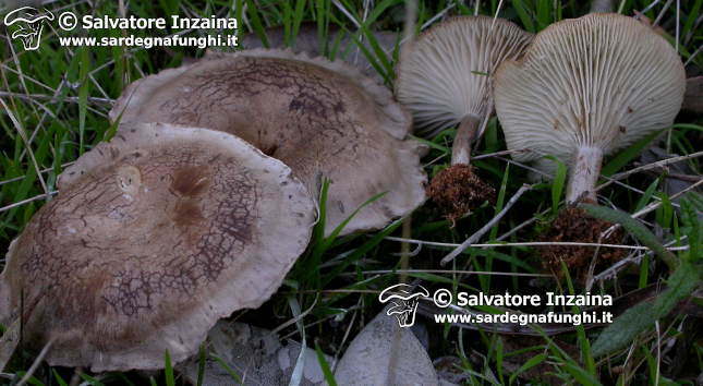Cappello 3-6 cm, inizialmente convesso, poi appianato fino a depresso, carnoso, assottigliato verso il margine; colore grigiastro, bruno-grigiastro, chiazzato di macule biancastre, tardivamente annerente alla contusione. Lamelle decorrenti, biancastre, con riflessi grigiastri. Gambo corto, grigiastro, piu o meno concolore al cappello, finemente pelosetto nella parte alta. Carne biancastra, odore netto di farina, sapore decisamente amaro; reazione rossastra al KOH sul cappello in exsiccata.